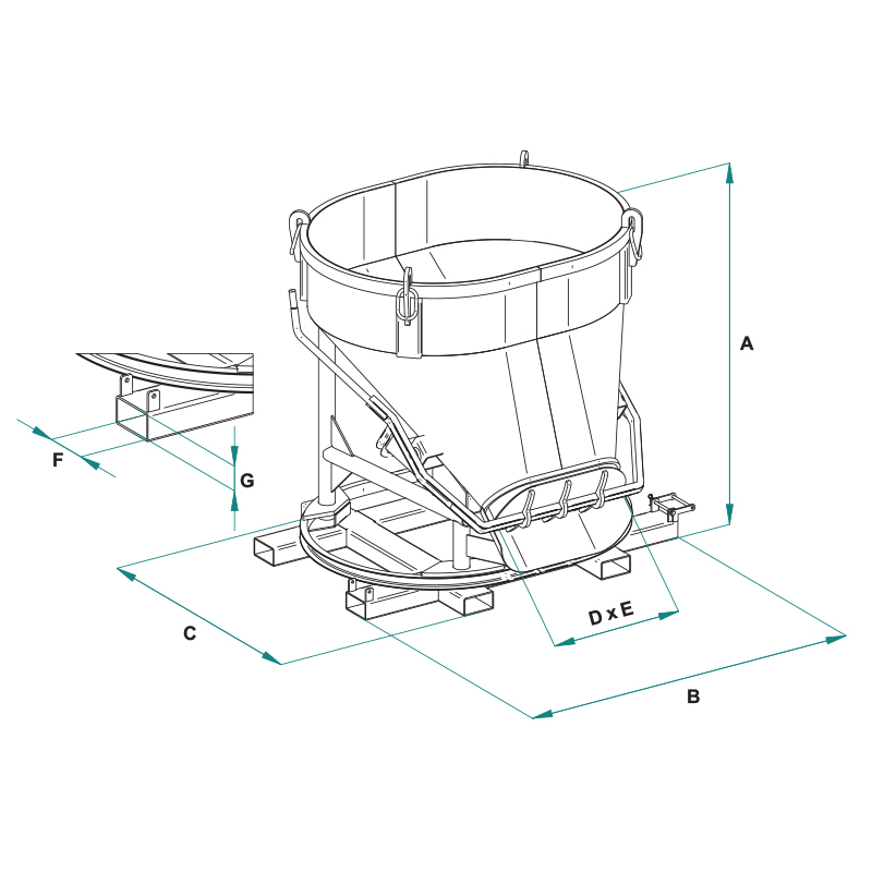 Il modello BOT-GAL è una benna per calcestruzzo di forma ovale, appositamente progettata per eccellere nelle operazioni di getto del calcestruzzo, specialmente nel settore della prefabbricazione. Dotato di scarico laterale con chiusura a ghigliottina e di un'ampia apertura controllata da due leve posizionate lateralmente, il BOT-GAL garantisce un controllo ottimale del calcestruzzo durante il processo di scarico, assicurando un flusso efficiente e sicuro. La base inforcabile consente un sollevamento rapido e sicuro tramite carrello elevatore o telescopico, contribuendo ad aumentare la produttività e a ridurre i tempi morti. Il sollevamento con gru avviene tramite quattro punti di presa per garantire stabilità. La finitura è realizzata con colore a polvere RAL 1003. Disponibile in